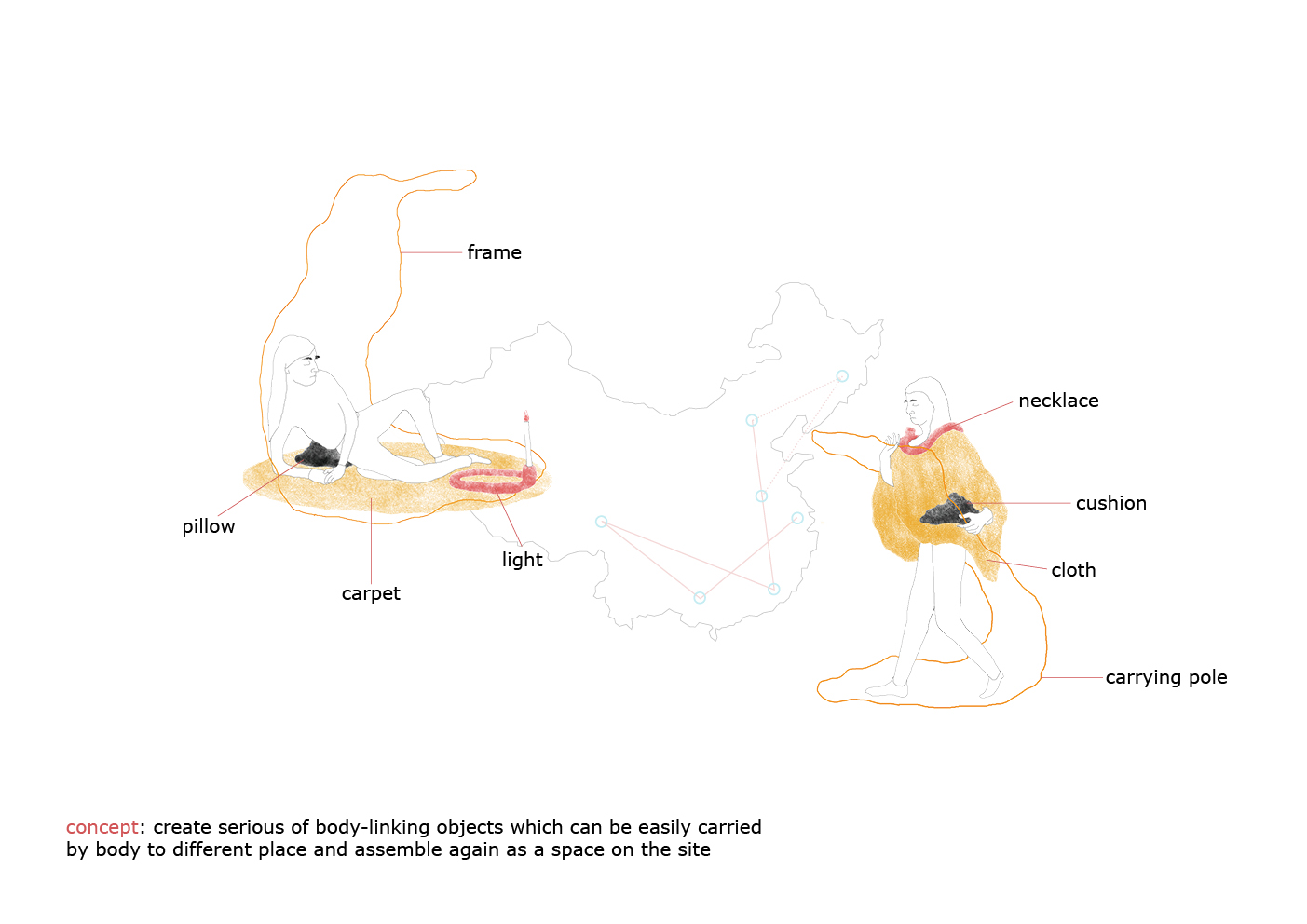 Attracted by this phenomenon I want to make a nomad house which composed by several body-liking objects. When people put on these objects they will become the cloths, shawl, necklace, cushion and shoulder pole. People can easily use their body to carry these objects with them to start their nomad life. When people get into a space and take off these objects, they will become several furniture like carpet, byobu, light, pillow and frame. They will work together with the space as a tiny “house”.